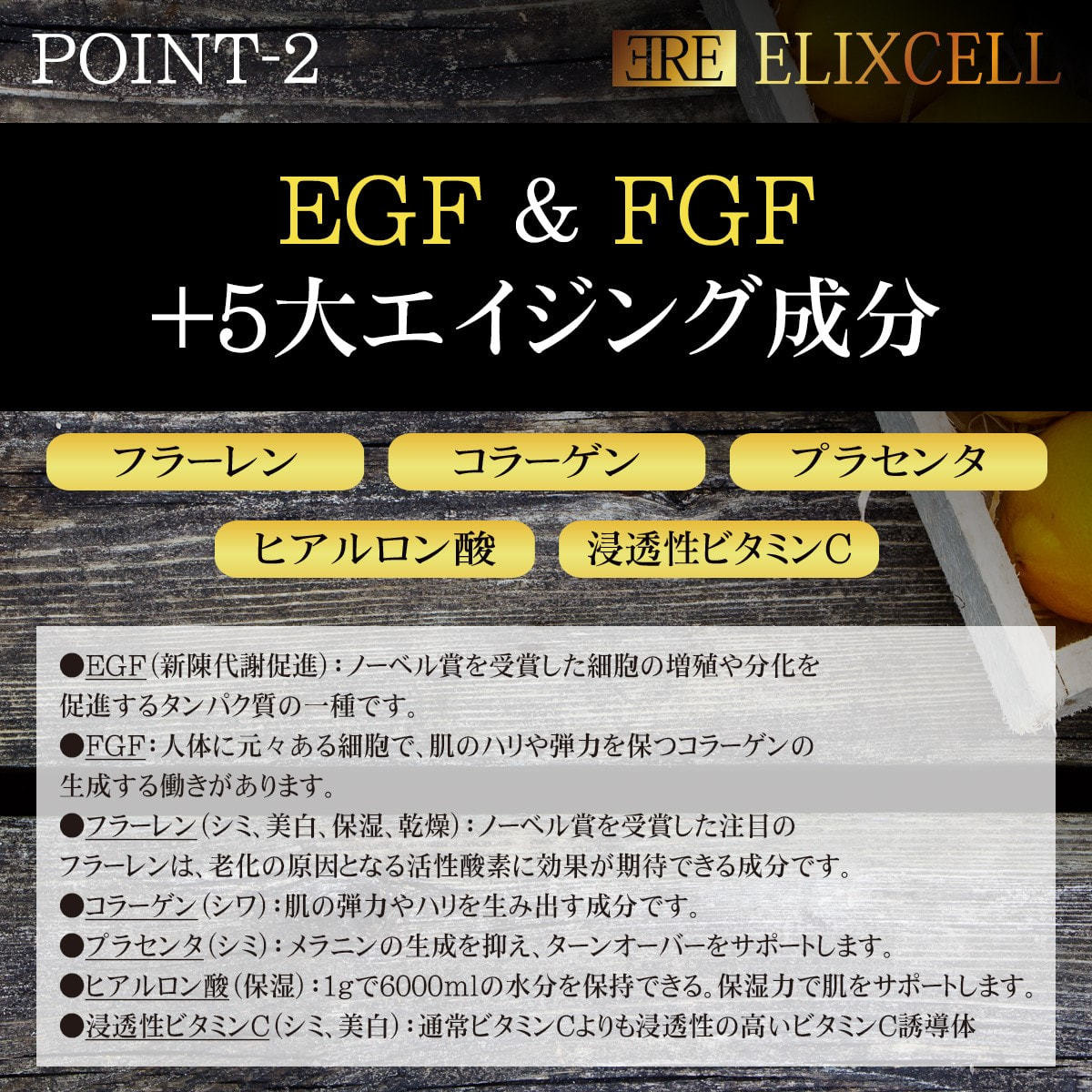 フラーレン、コラーゲン、プラセンタ、ヒアルロン酸、浸透性ペプチドビタミンC誘導体、リソサムニウムカルカラムエキス、オニサルビアエキス